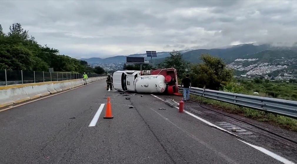 Chilpancingo, Gro., a 28 de julio de 2022.- Una pipa que transporta gas LP volcó este jueves por la mañana sobre la Autopista del Sol, adelante de la caseta de cobro de Palo Blanco en Chilpancingo.